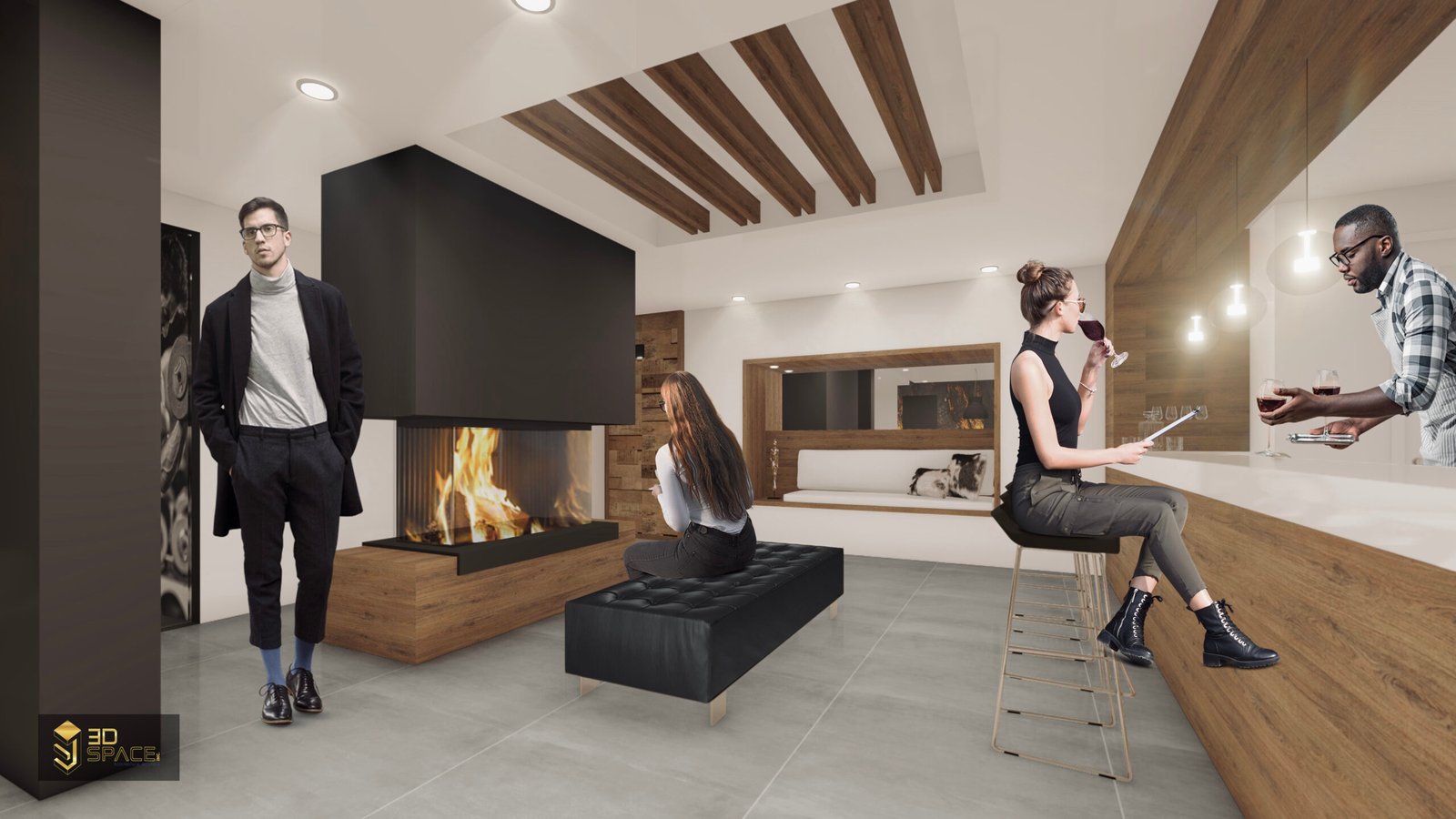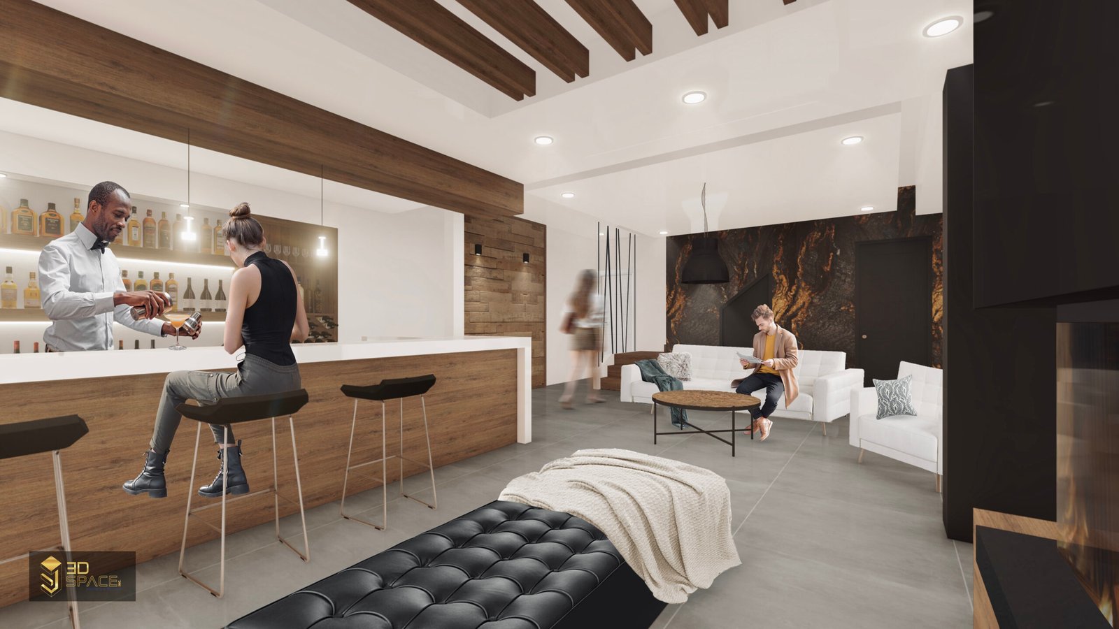 Proyecto de diseño interior para un bar privado ubicado en el basement de una casa de lujo en Nueva York. La propuesta integra materiales cálidos como madera natural, iluminación ambiental y detalles modernos que aportan elegancia y confort. El espacio combina área de barra, zona social y rincones de descanso alrededor de una chimenea contemporánea, creando un ambiente exclusivo ideal para reuniones privadas. El diseño busca maximizar el espacio subterráneo, ofreciendo una experiencia sofisticada dentro del entorno residencial.