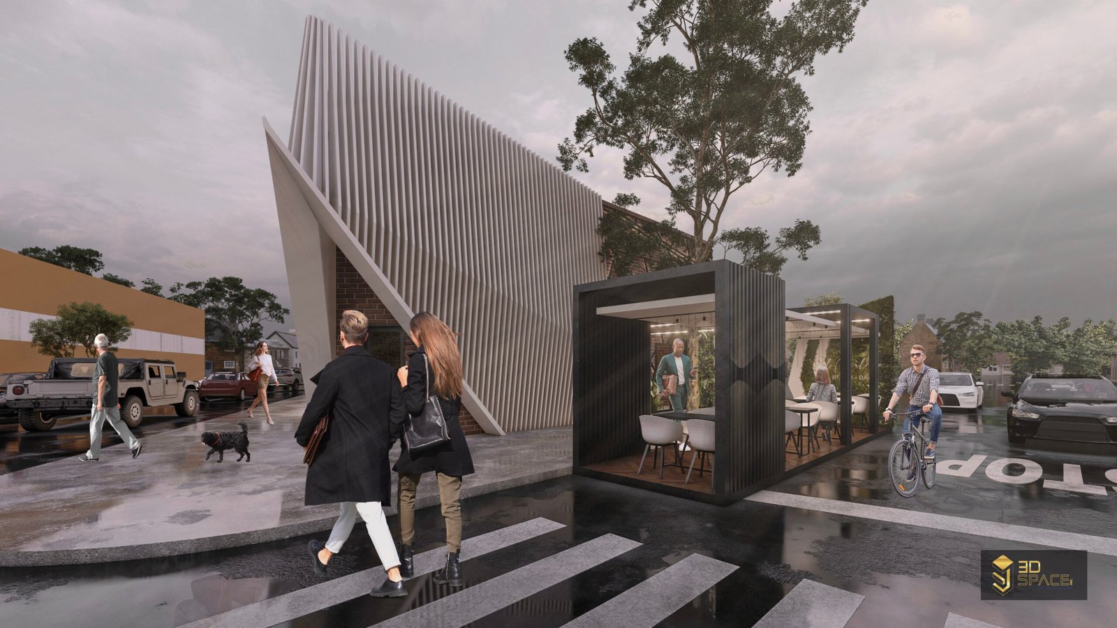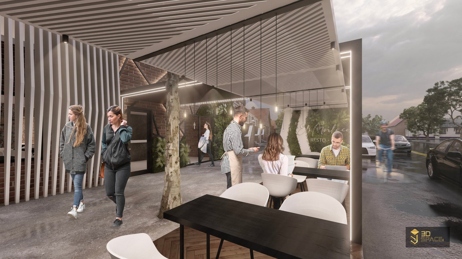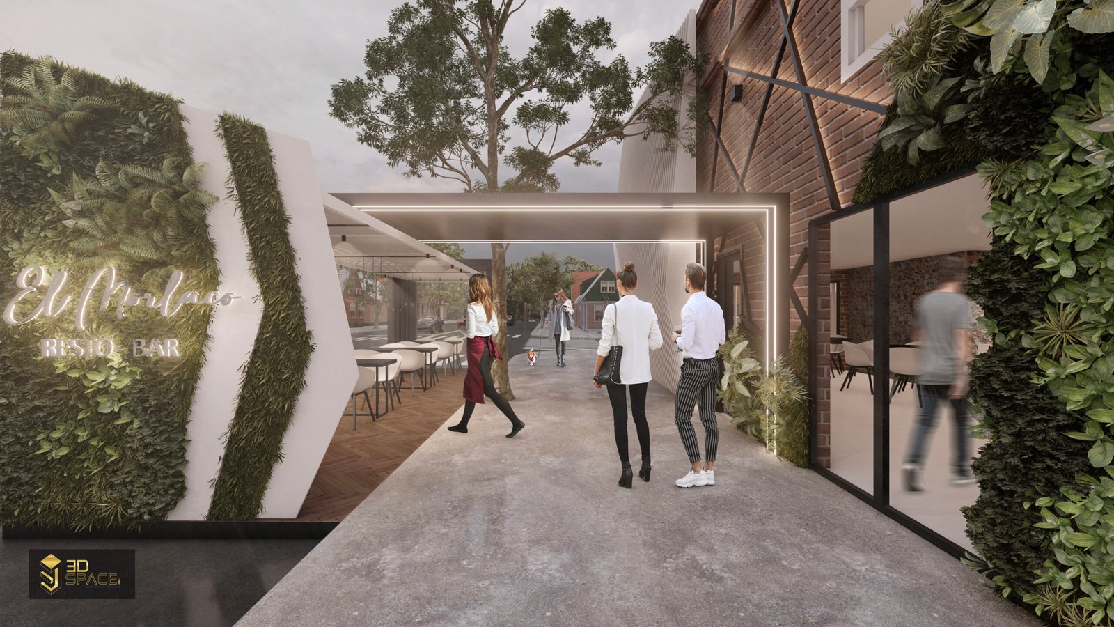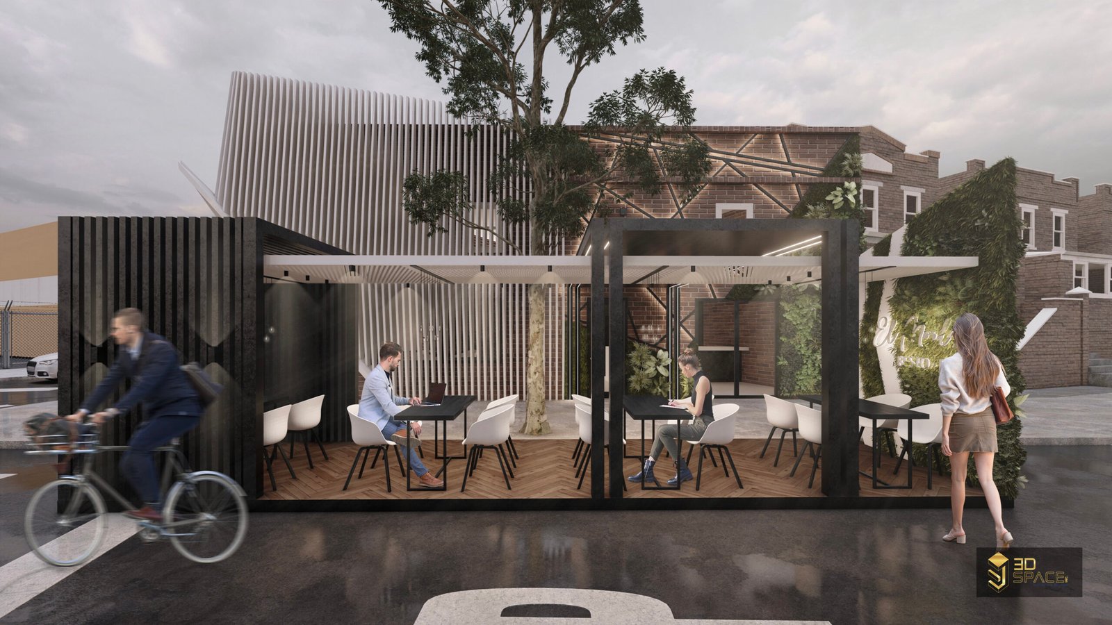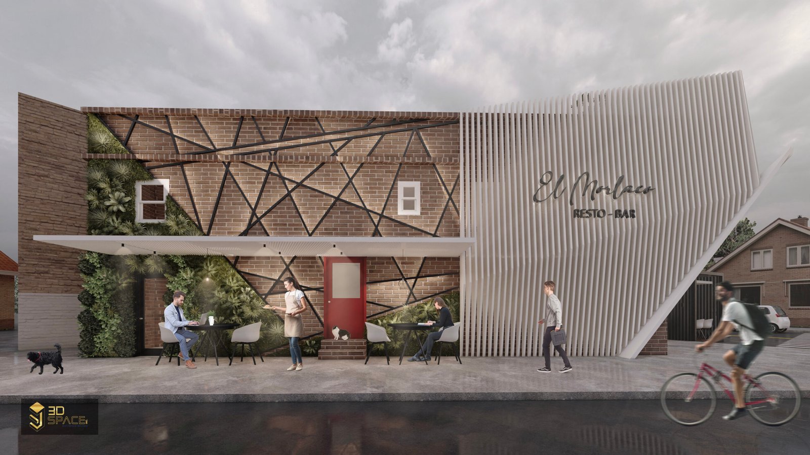 Propuesta de diseño exterior para el restaurante El Cuencanito, ubicado en Corona, Queens. El proyecto destaca por una fachada contemporánea que combina texturas de ladrillo, geometrías diagonales y un volumen principal inclinado que aporta identidad y presencia urbana. La intervención incluye un espacio exterior diseñado especialmente para integrarse con el restaurante, extendiendo visual y funcionalmente el área de atención hacia la calle. Este exterior unificado crea una transición fluida entre interior y exterior, fortaleciendo la imagen del local y ofreciendo un ambiente atractivo y moderno para los visitantes.