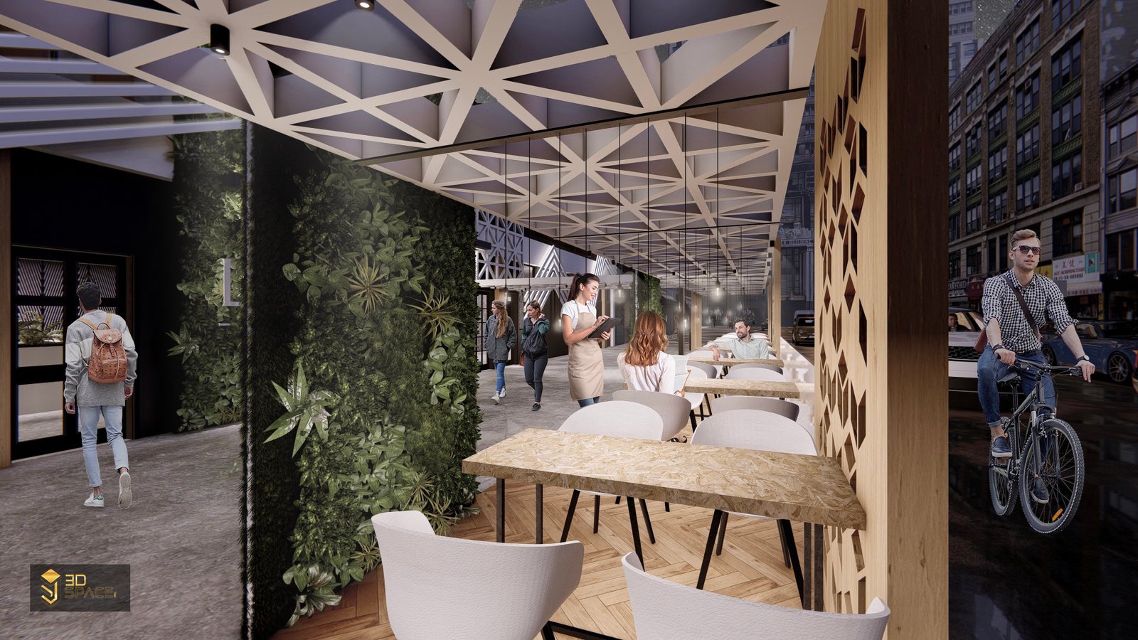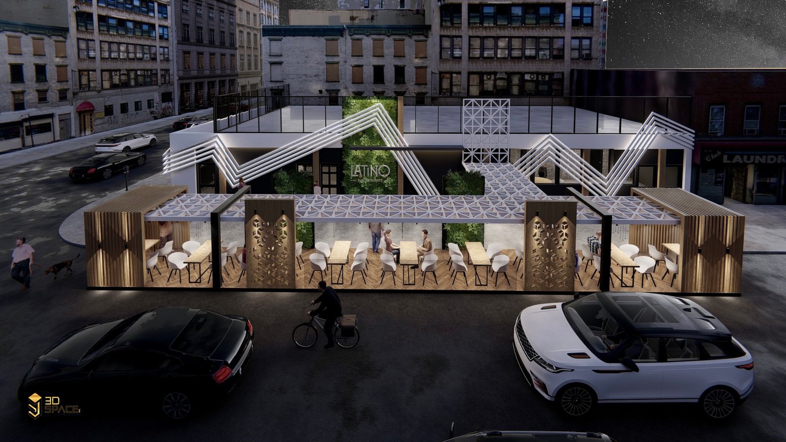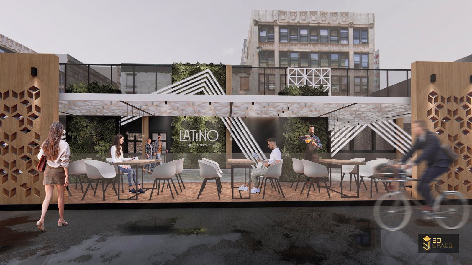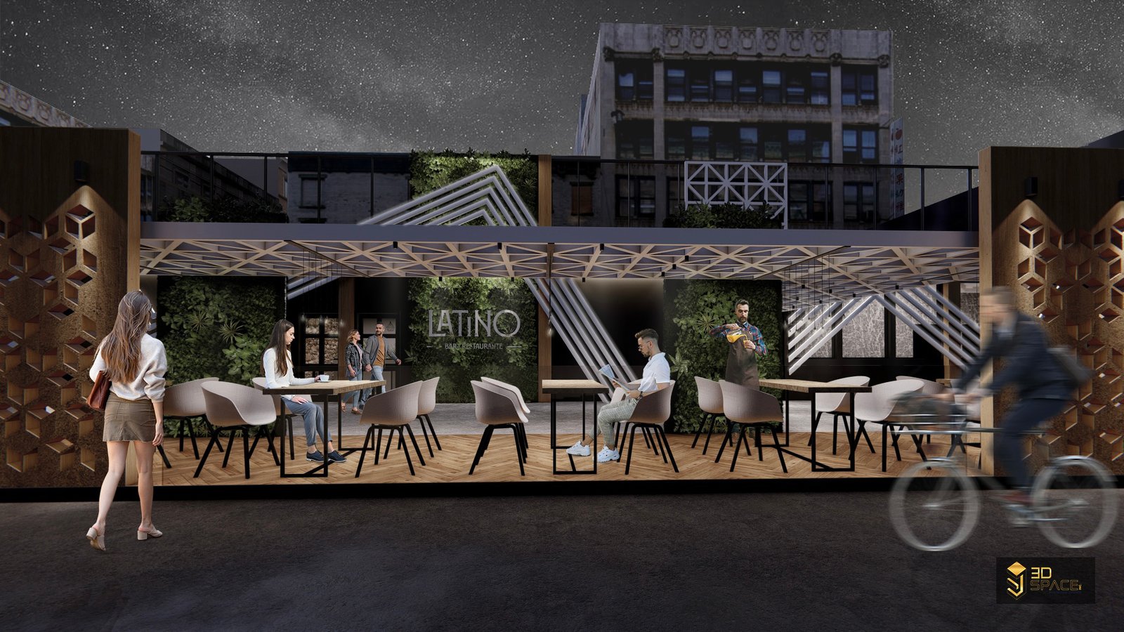 Propuesta de diseño exterior para el bar–restaurante Sabor Latino, ubicado en Corona, Queens. El proyecto incorpora una ampliación hacia la calle que extiende el área de atención y crea una conexión visual fluida con la fachada principal. El diseño destaca por su estructura modular con entramados geométricos, paneles decorativos y muros verdes que aportan identidad y frescura al espacio. También integra iluminación arquitectónica y cubiertas ligeras que generan un ambiente moderno y dinámico, ideal para el servicio al aire libre y para reforzar la presencia del restaurante en su entorno urbano.
