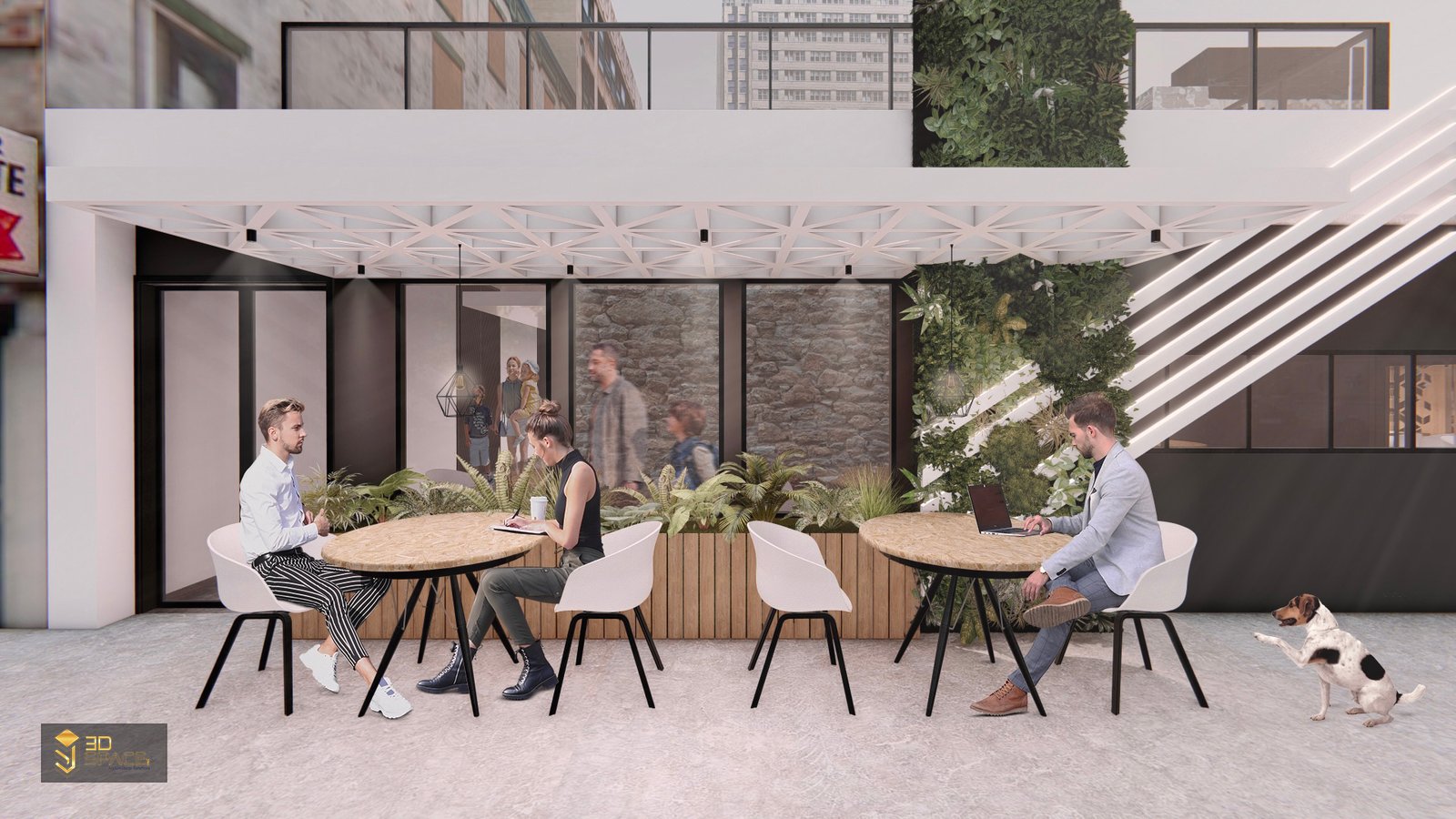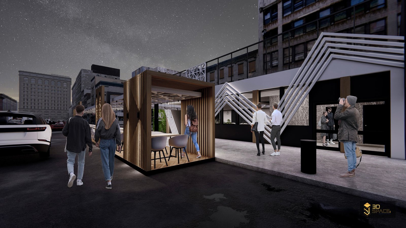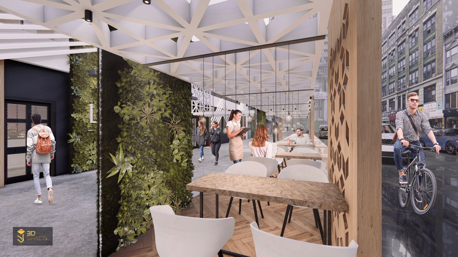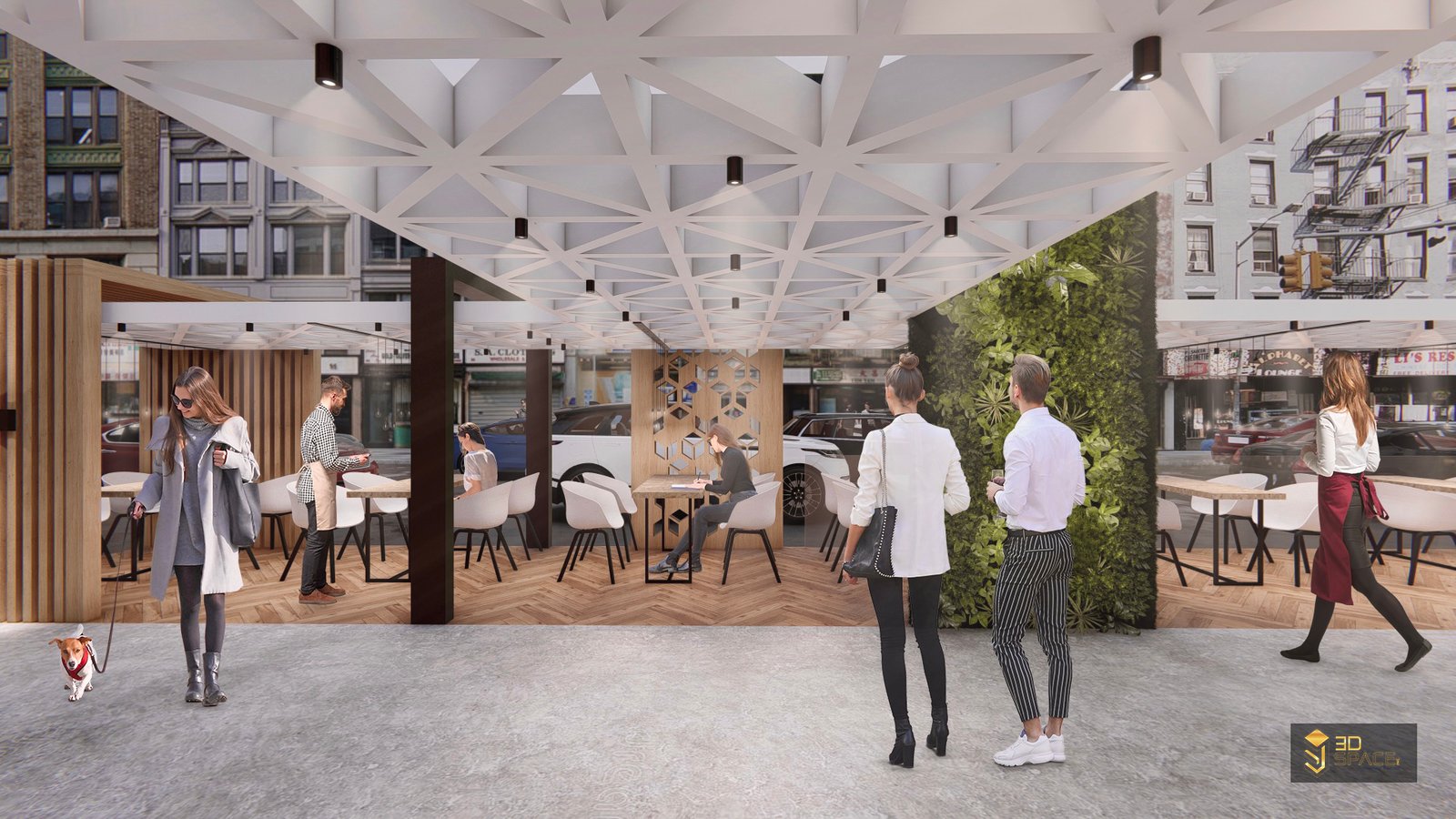 Propuesta de diseño exterior para el bar–restaurante Sabor Latino, ubicado en Corona, Queens. El proyecto incorpora una ampliación hacia la calle que extiende el área de atención y crea una conexión visual fluida con la fachada principal. El diseño destaca por su estructura modular con entramados geométricos, paneles decorativos y muros verdes que aportan identidad y frescura al espacio. También integra iluminación arquitectónica y cubiertas ligeras que generan un ambiente moderno y dinámico, ideal para el servicio al aire libre y para reforzar la presencia del restaurante en su entorno urbano.